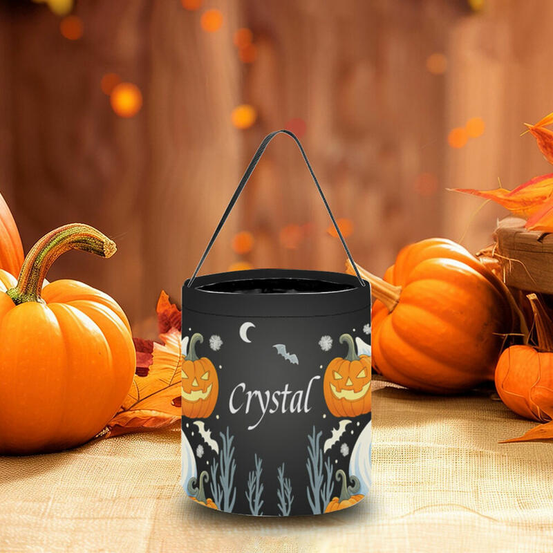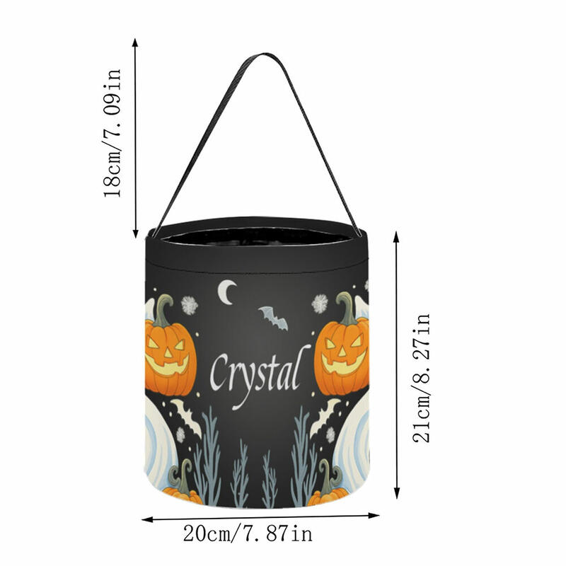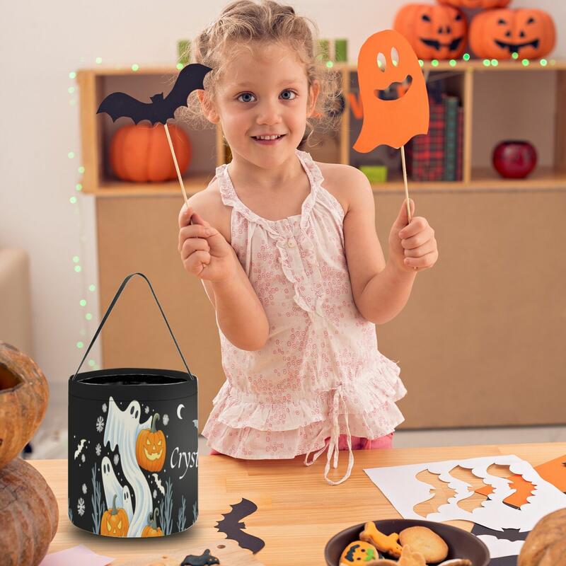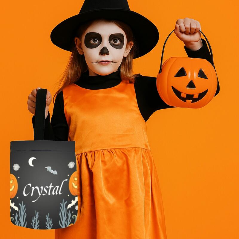 Individuell gestalteter Halloween-Korb mit Namen Kürbis-Süßigkeiten-Eimer Tragetasche für Kinder