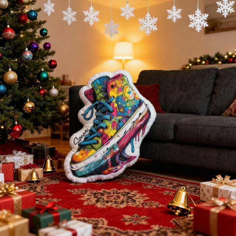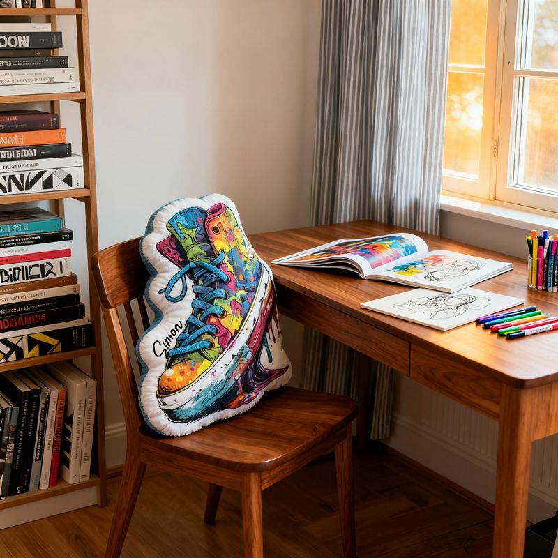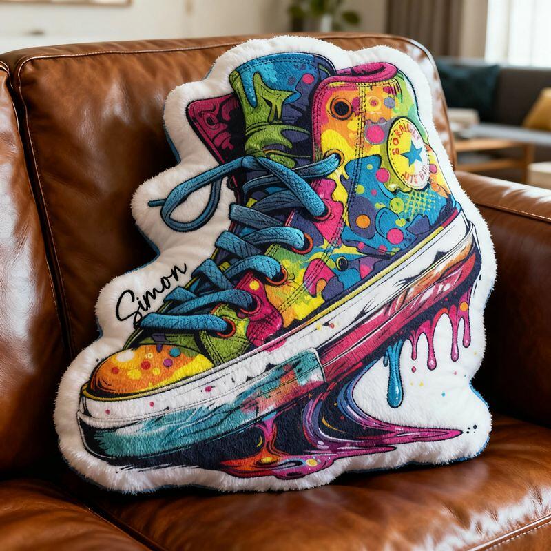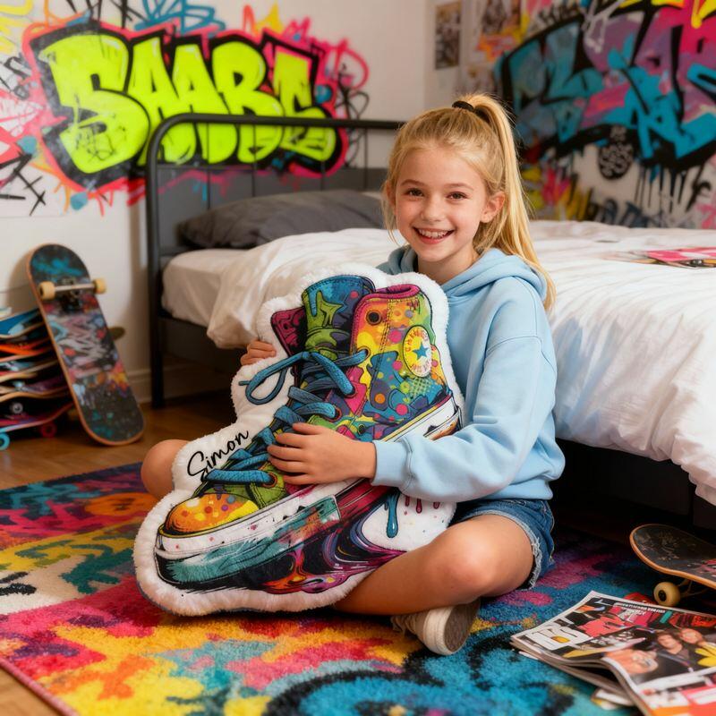 Personalisiertes Kissen in Cartoon-Form mit Sneaker und buntem Graffiti-Design cooles Geschenk für Kinder