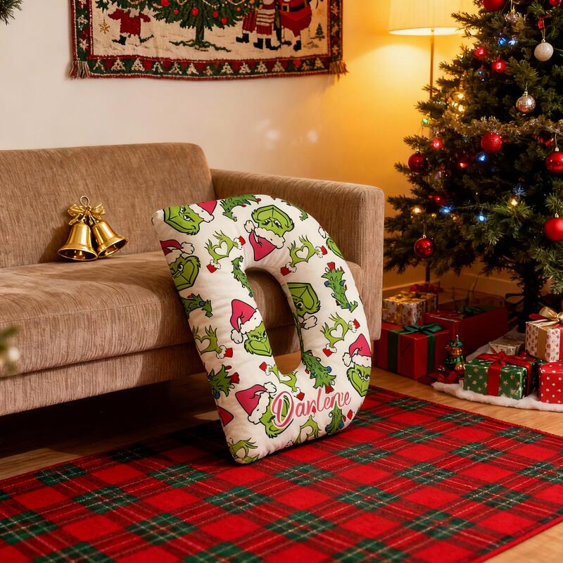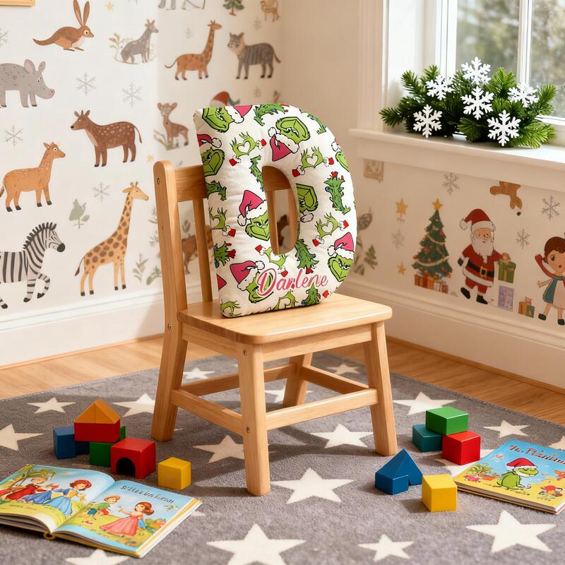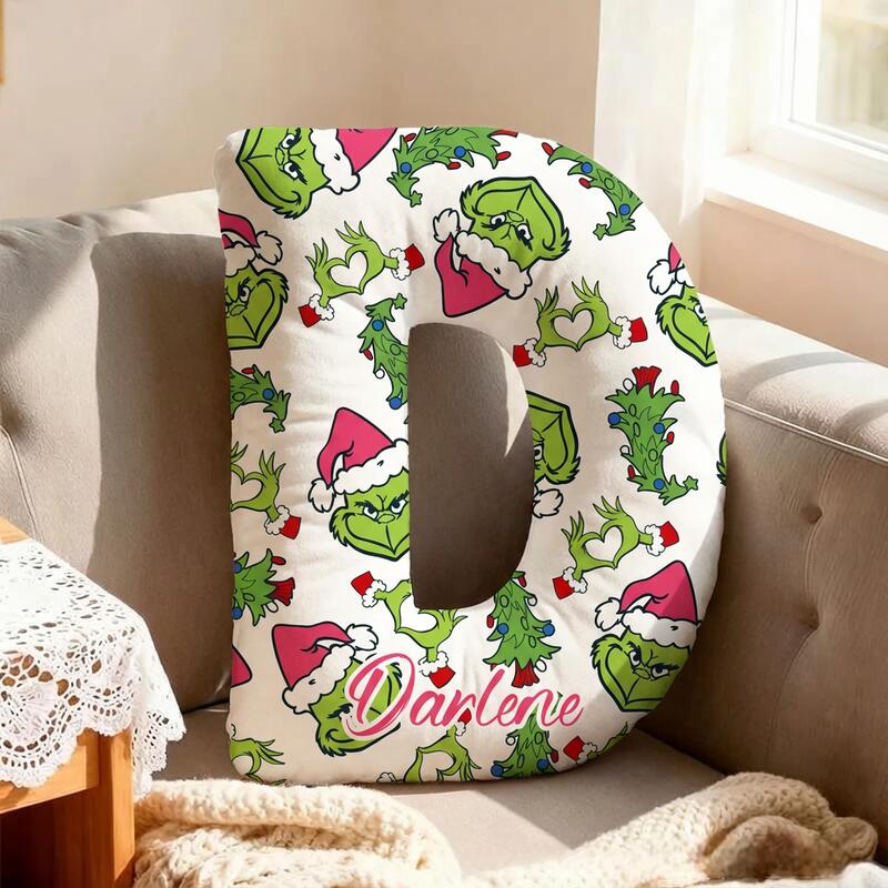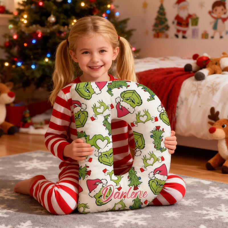 Personalisiertes grünes Kissen mit Cartoon-Figuren und Buchstaben als Weihnachtsgeschenk für Kinder